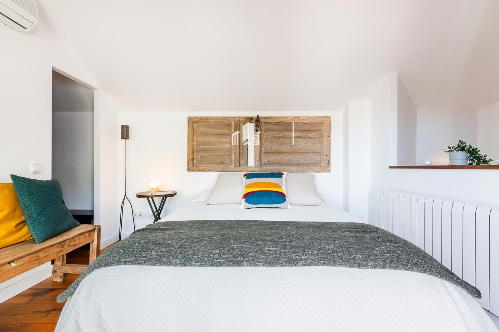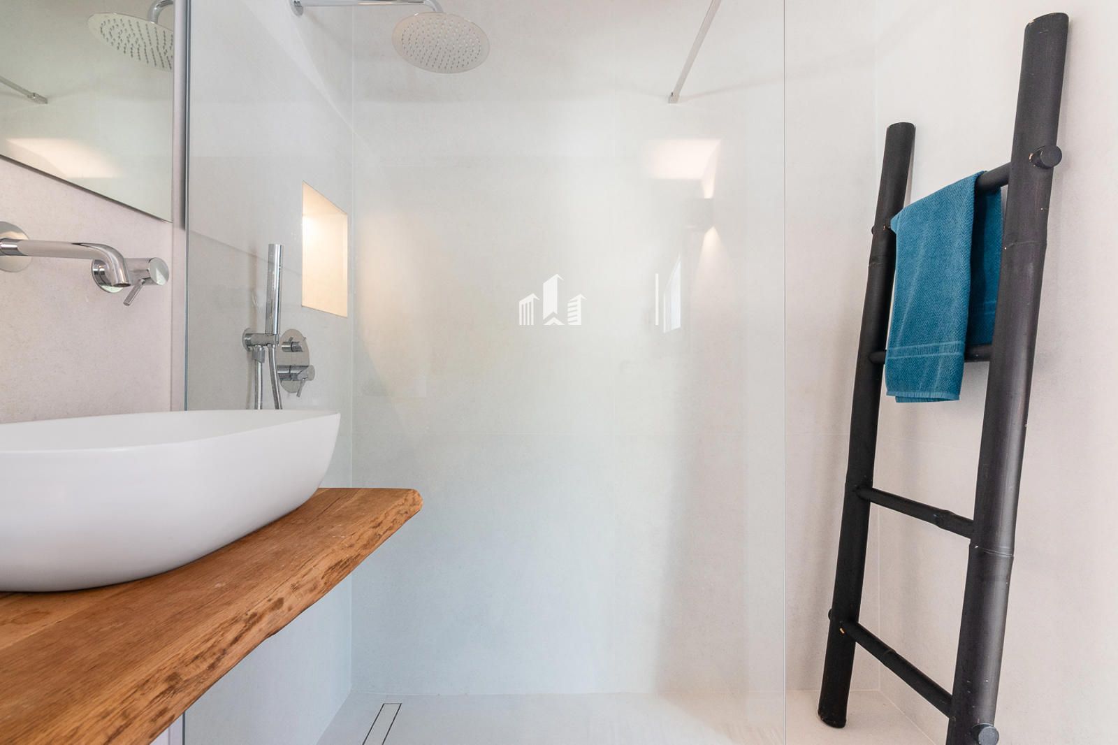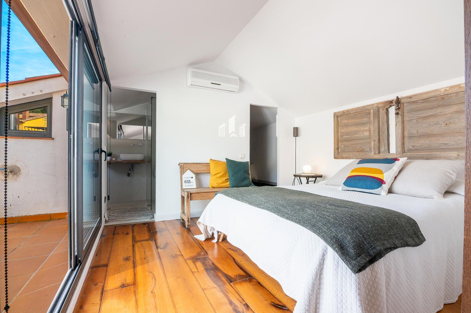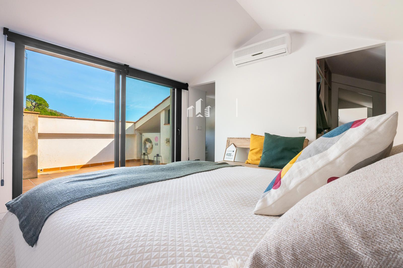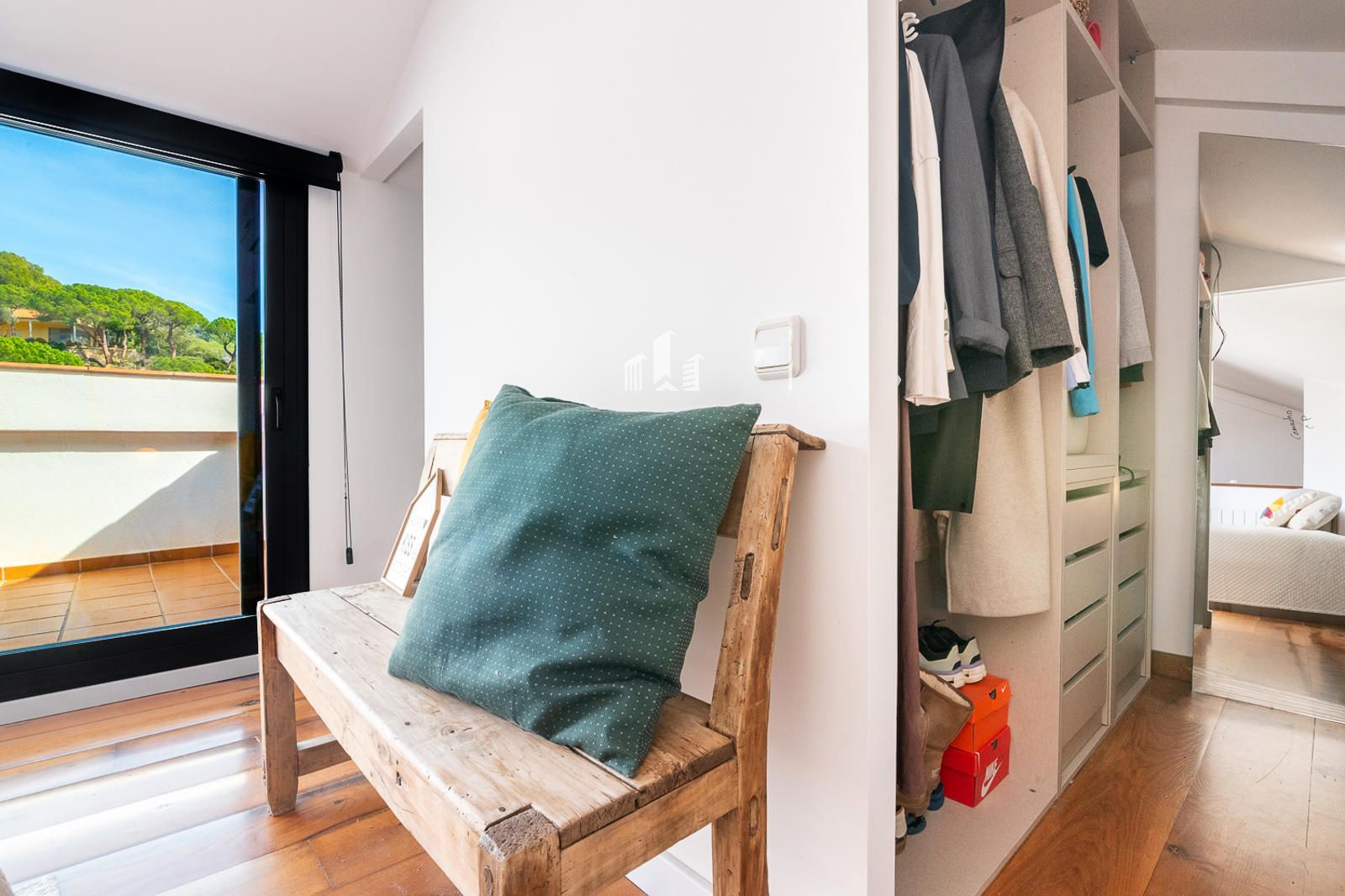 Subiendo a la planta superior, el estudio se transforma en un verdadero oasis. Un dormitorio con baño completo y vestidor se abre a una terraza privada con vistas panorámicas que conectan la serenidad de la montaña con la calma del mar. Allí puedes desayunar contemplando el horizonte, trabajar con inspiración, relajarte o simplemente desconectar del mundo. Incluso la terraza incorpora una zona de lavandería, mostrando cómo la funcionalidad se une al lujo y al confort.