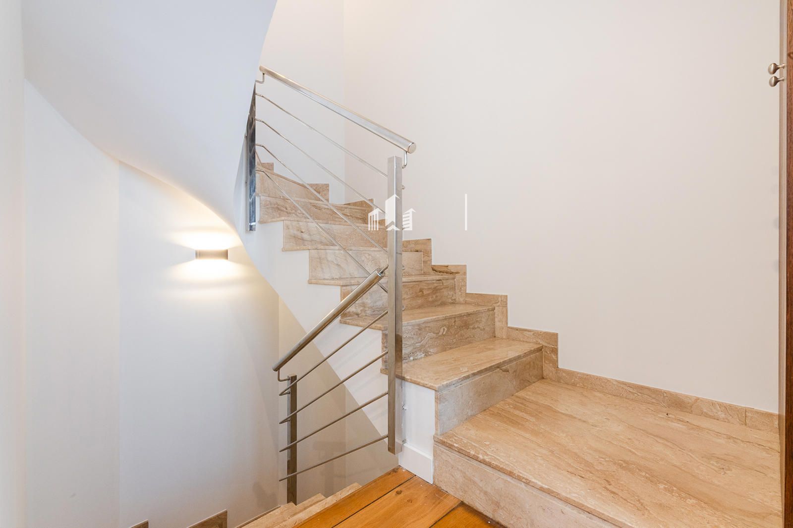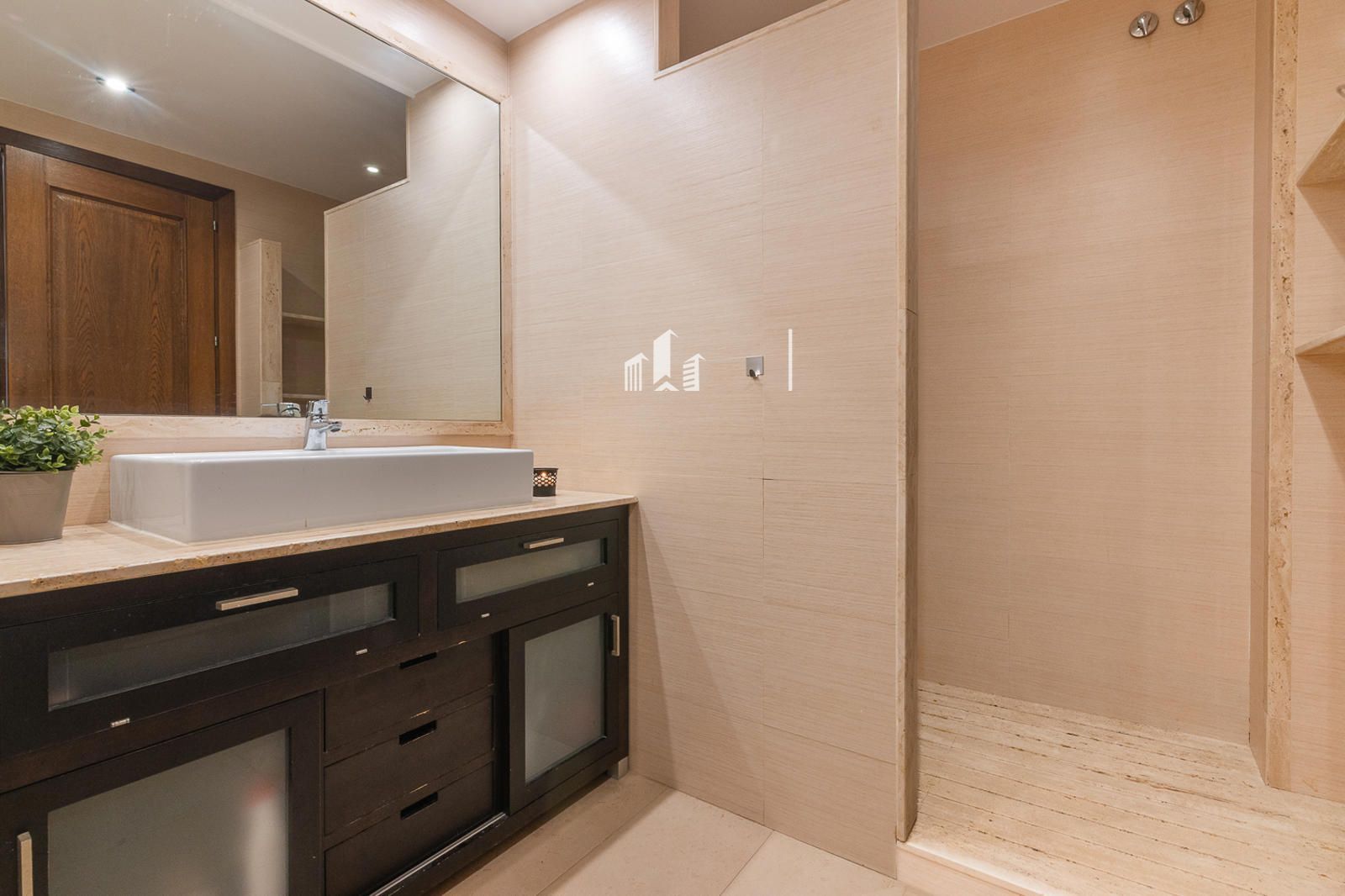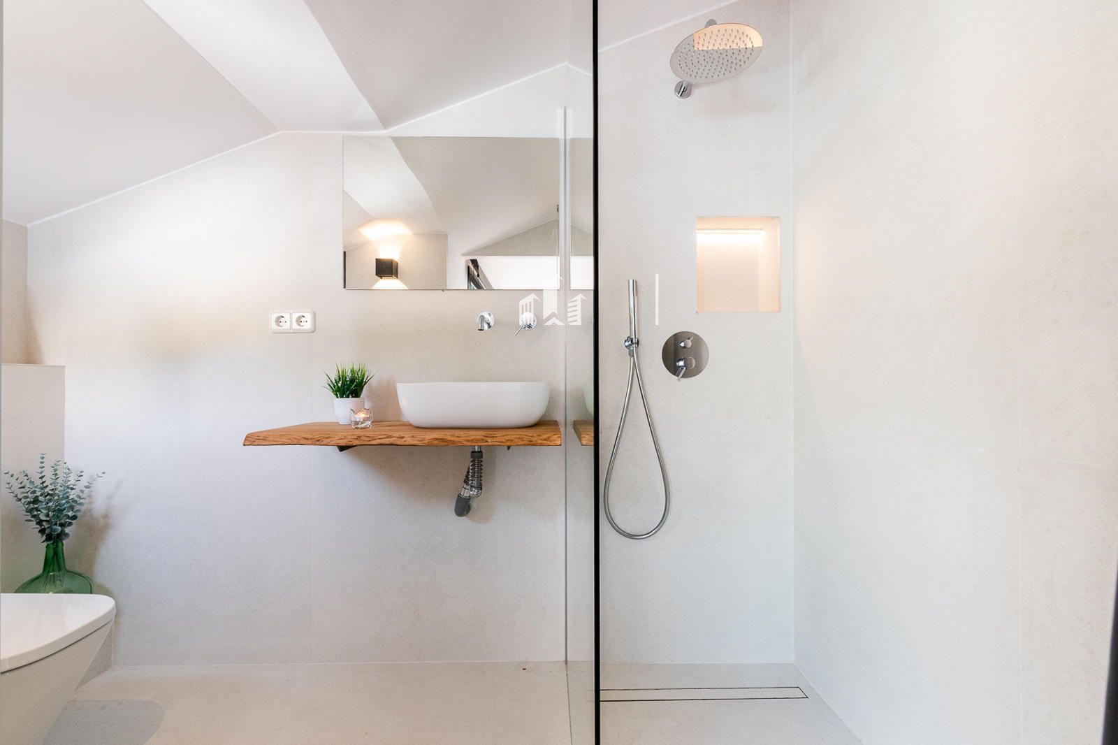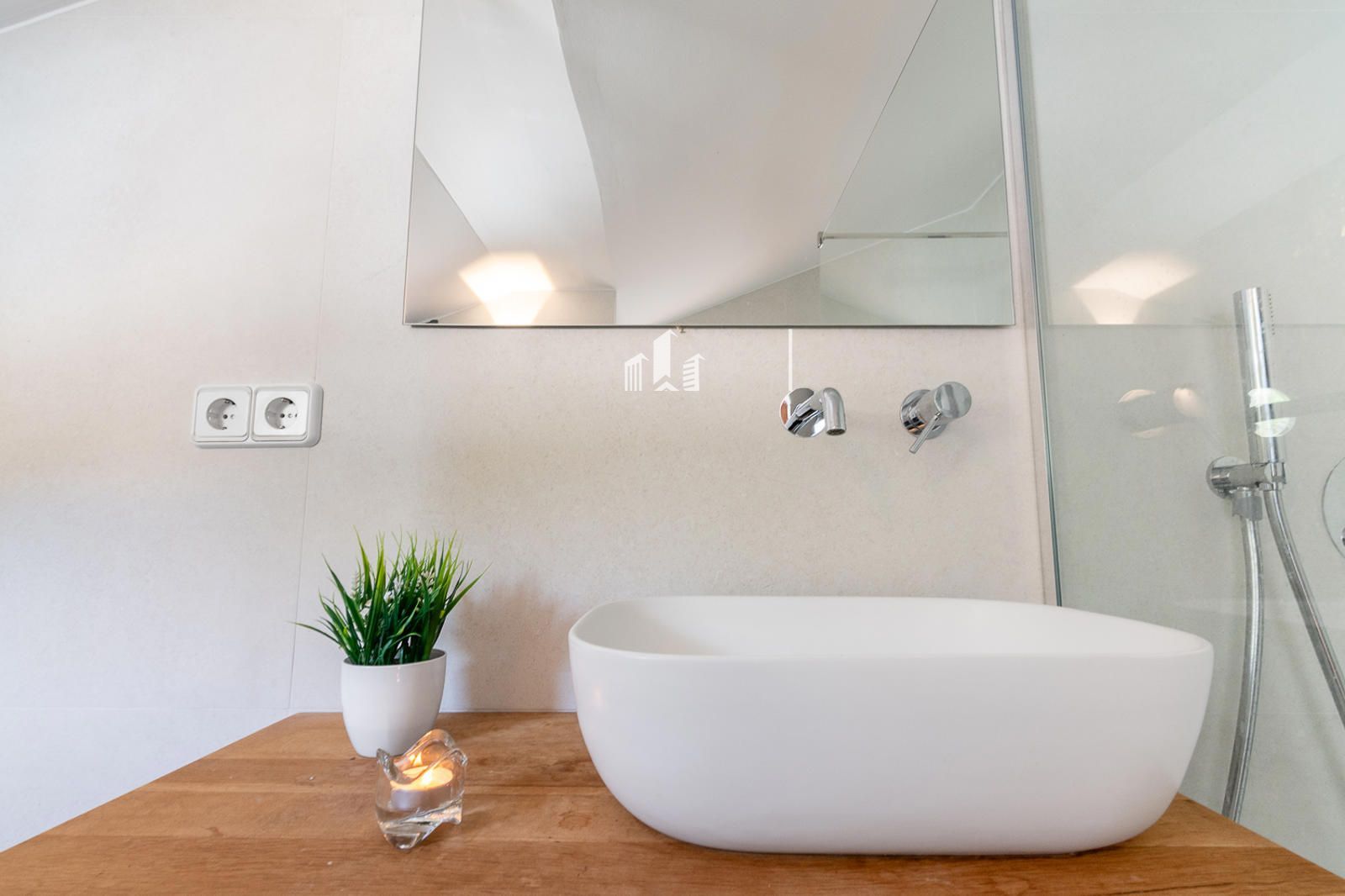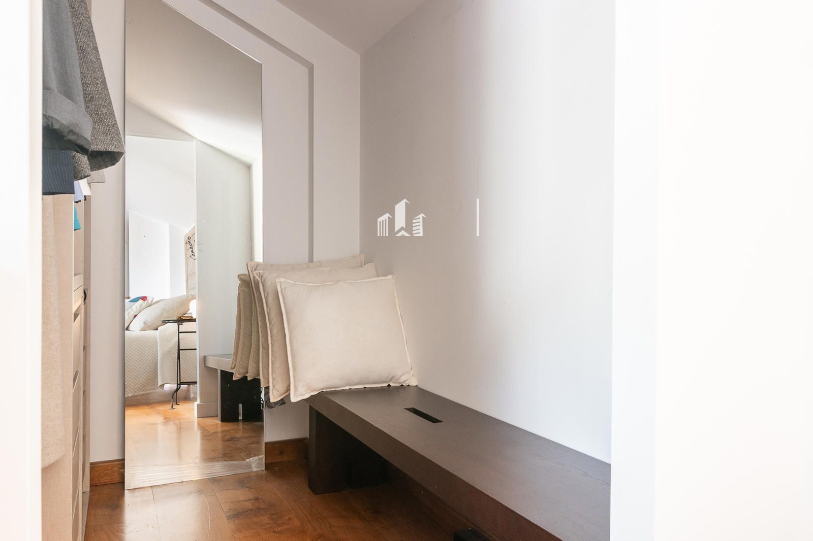 Subiendo a la planta superior, el estudio se transforma en un verdadero oasis. Un dormitorio con baño completo y vestidor se abre a una terraza privada con vistas panorámicas que conectan la serenidad de la montaña con la calma del mar. Allí puedes desayunar contemplando el horizonte, trabajar con inspiración, relajarte o simplemente desconectar del mundo. Incluso la terraza incorpora una zona de lavandería, mostrando cómo la funcionalidad se une al lujo y al confort.